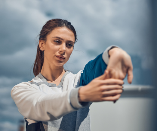 • Rozluźnij ramiona i barki, opuść i wyprostuj całą rękę na wprost siebie. Teraz zegnij rękę w nadgarstku i wyprostuj palce do góry. Drugą ręką wypychaj okolicę śródręcza i palców do siebie. Przytrzymaj rękę zgiętą w nadgarstku przez 10 sekund. Powtórz ćwiczenie 5 razy.